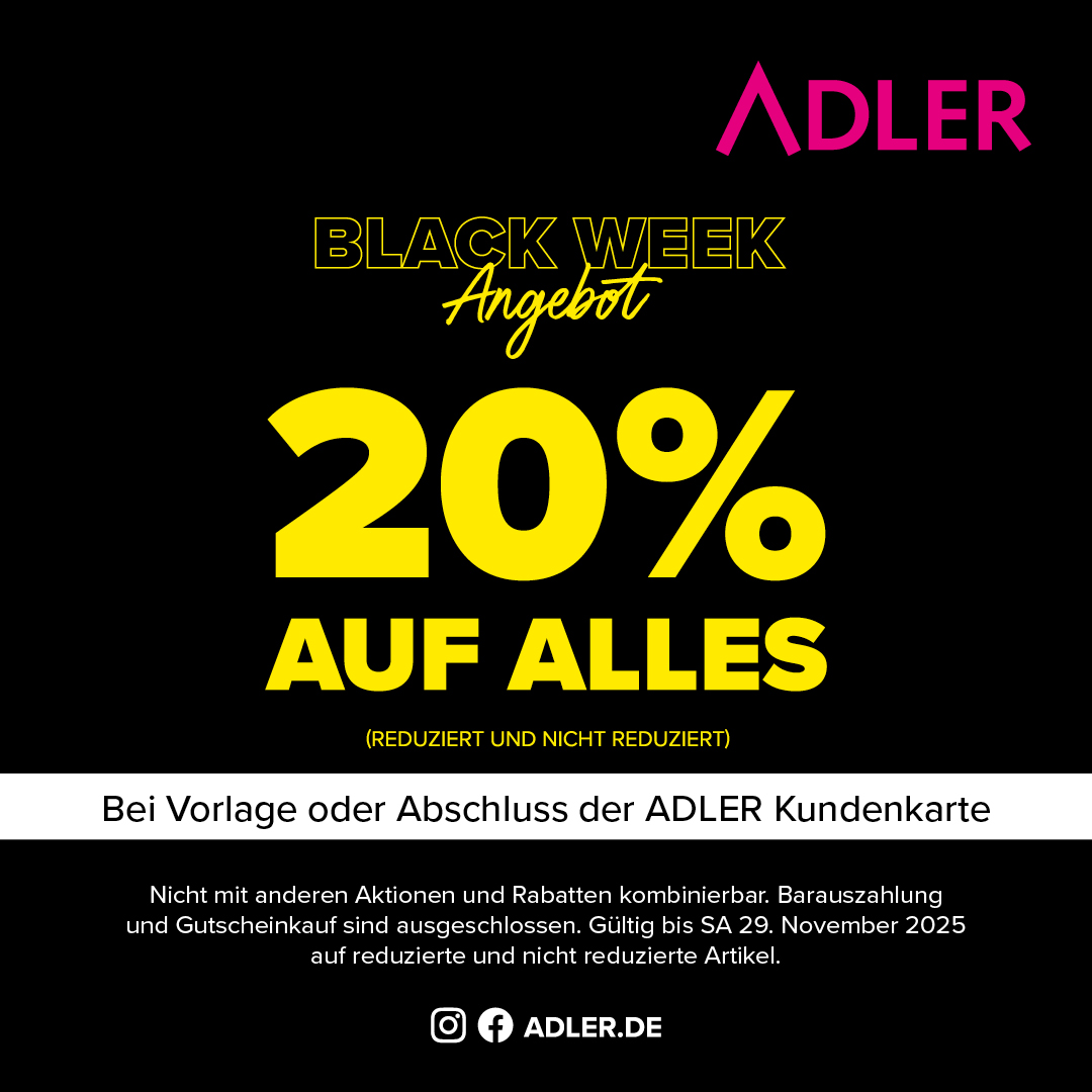 Sparen Sie 20% auf alles! Einfach ADLER Kundenkarte vorzeigen oder abschließen und 20% sparen.